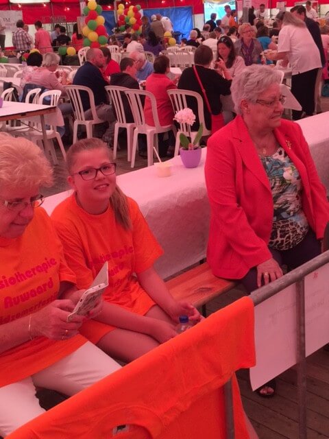 Wij hebben al vaker meegedaan aan het Midzomerfestijn en proberen het wiel van de spinningfiets te laten draaien door onze cliënten te laten trappen. Ook dit jaar is dat weer uitstekend gelukt. Om 11.00 uur stond de eerste cliënt al klaar en elk kwartier werd “de fietser” vervangen door een andere. Het is mooi om te zien dat onze cliënten herstellende van bijvoorbeeld een heupoperatie of andere aandoening de moeite nemen en enthousiast zijn om ook een kwartier te fietsen voor het goede doel. Bijgestaan door hun therapeut fietsten ze gewoon hun kwartier uit ook al was het voor sommige cliënten best pittig en zorgde het warme weer voor menig zweetdruppeltje. Als bedankje kreeg iedere fietser een mooi zadelhoesje en een verkoelend drankje.