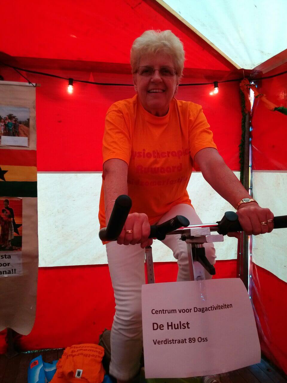 Wij hebben al vaker meegedaan aan het Midzomerfestijn en proberen het wiel van de spinningfiets te laten draaien door onze cliënten te laten trappen. Ook dit jaar is dat weer uitstekend gelukt. Om 11.00 uur stond de eerste cliënt al klaar en elk kwartier werd “de fietser” vervangen door een andere. Het is mooi om te zien dat onze cliënten herstellende van bijvoorbeeld een heupoperatie of andere aandoening de moeite nemen en enthousiast zijn om ook een kwartier te fietsen voor het goede doel. Bijgestaan door hun therapeut fietsten ze gewoon hun kwartier uit ook al was het voor sommige cliënten best pittig en zorgde het warme weer voor menig zweetdruppeltje. Als bedankje kreeg iedere fietser een mooi zadelhoesje en een verkoelend drankje.